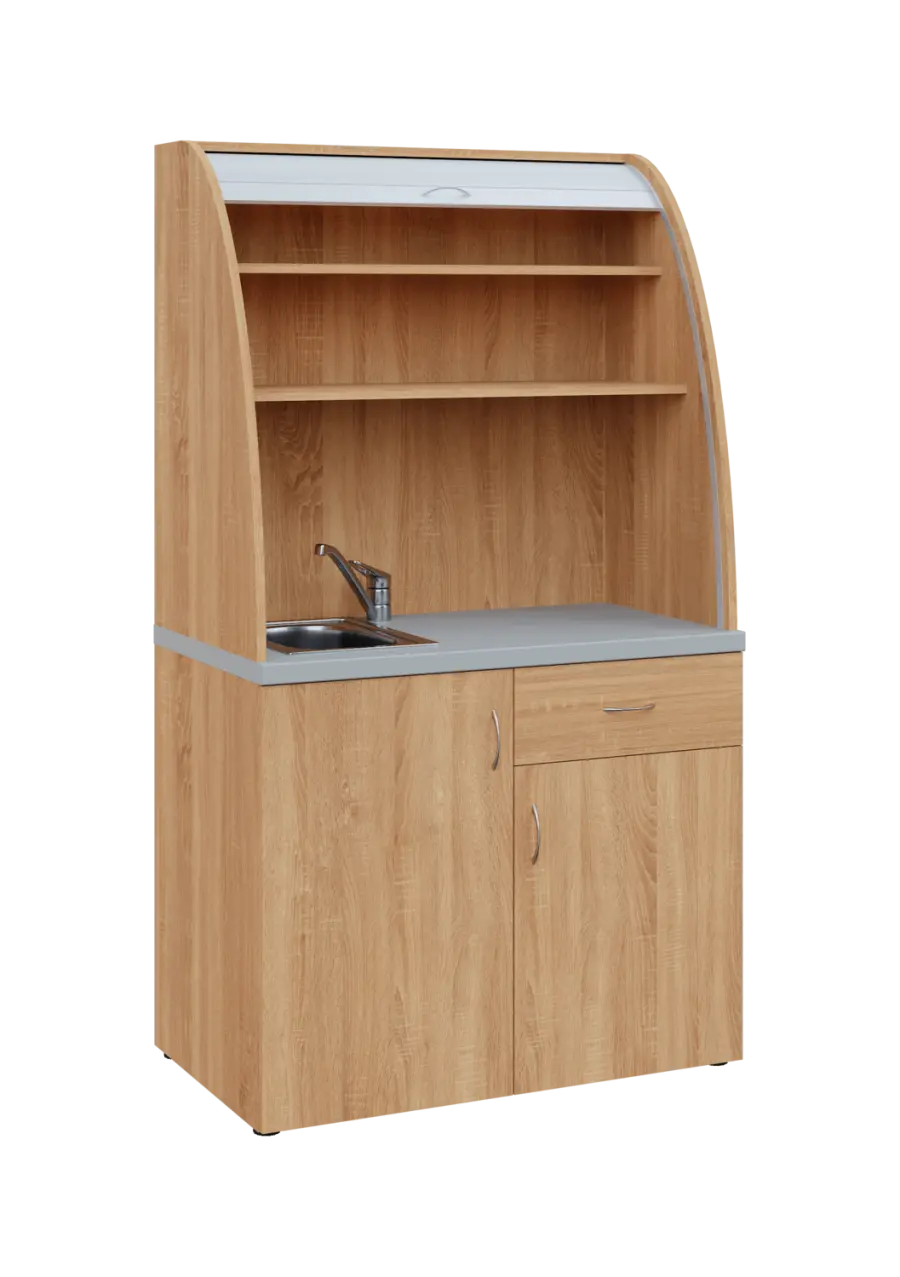 postformingová pracovní deska v šedém provedení, průchodka pro protažení kabelu, na přání lze vybavit zámkem