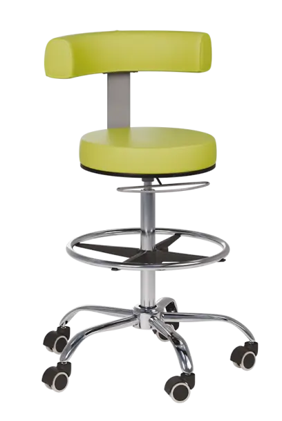 židle s nožním ovládáním, výškové nastavení sedu pomocí nožního ovladače nebo pomocí kruhového ovladače pod celým obvodem sedáku, čalouněno v ekologické kůži