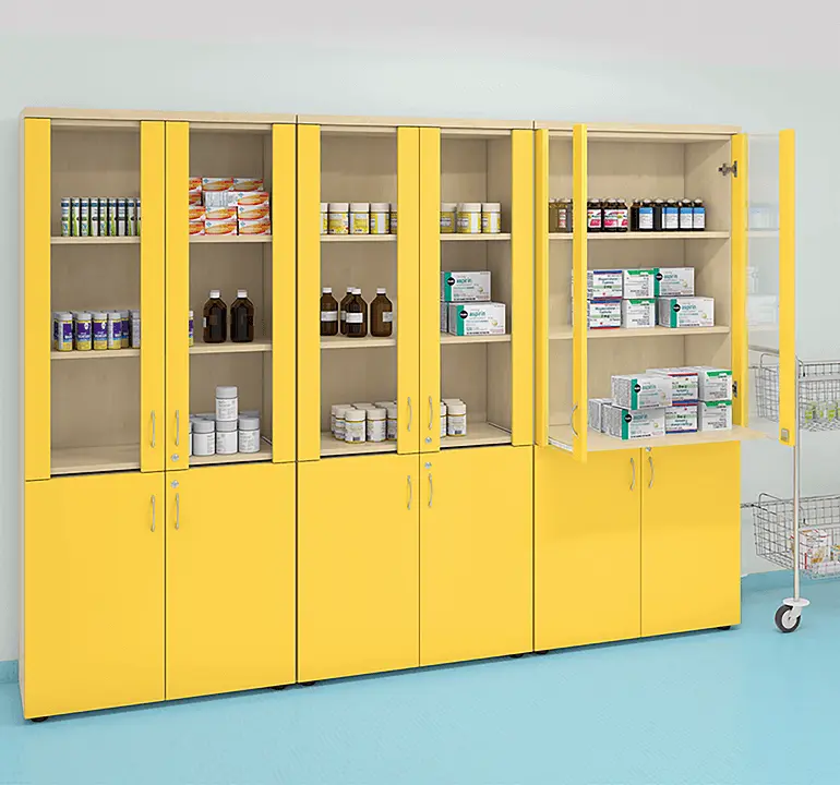 lékařská prosklená skříň, vyrobeno z kvalitního lamina o síle 18 mm, ABS hrana pro zvýšení životnosti, vybaveny výsuvnou odkládací deskou