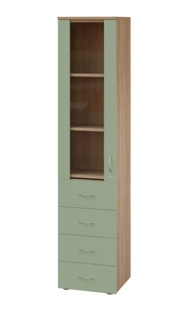 LE - 44 skříň léková prosklená, levá, korpus dub bardolino, dvířka šedo-zelinkavá