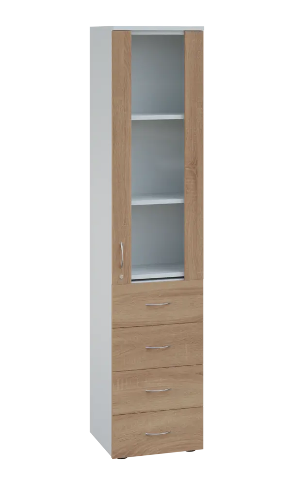 LE - 44 skříň léková prosklená, pravá, korpus bílý, dvířka dub bardolino