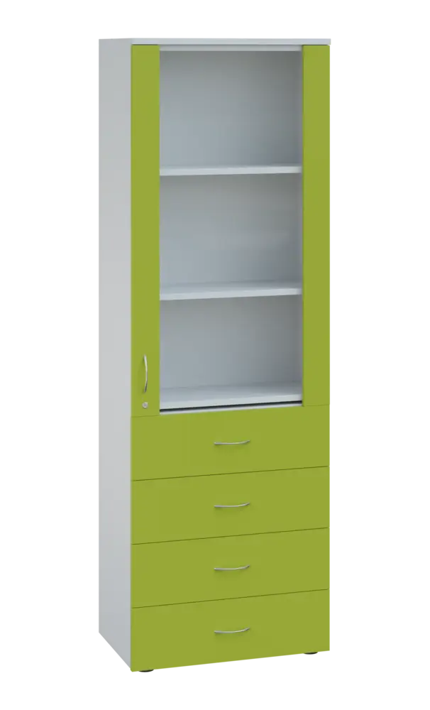 LE - 64 skříň léková prosklená, pravá, korpus bílý, dvířka jarní zeleň