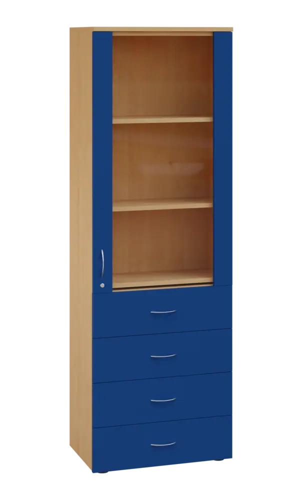LE - 64 skříň léková prosklená, pravá, korpus javor horský, dvířka královská modř