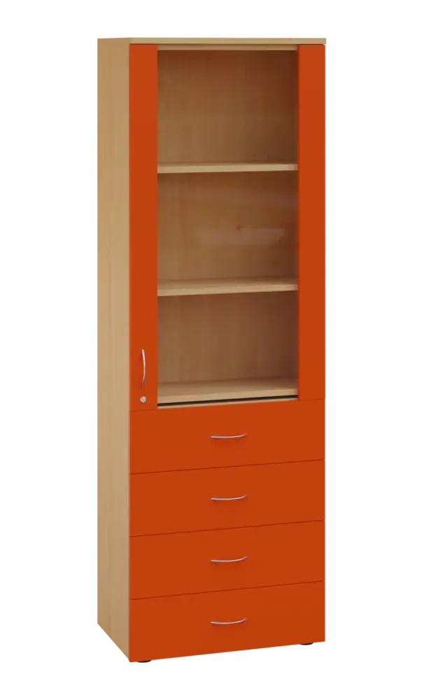 LE - 01 skříň lékařská prosklená, korpus bílá, dvířka pomeranč