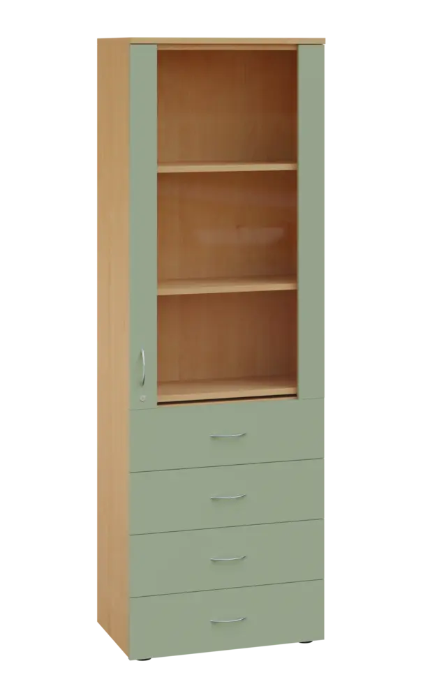 LE - 64 skříň léková prosklená, pravá, korpus javor horský, dvířka šedo-zelinkavá