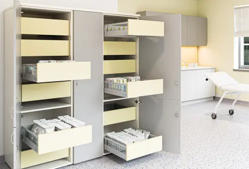 zásuvkové lékařské skříně zajišťují snadnou manipulaci, přehlednost a maximální využití prostoru, zásuvky se snadno vysouvají a zasouvají i při plném zatížení