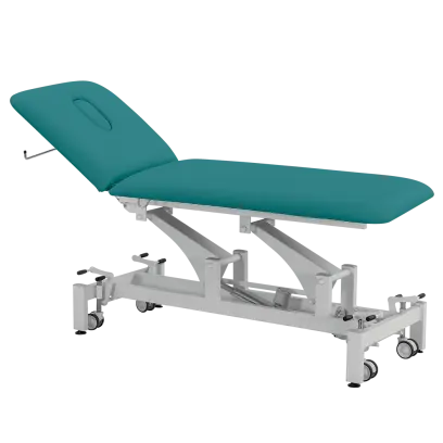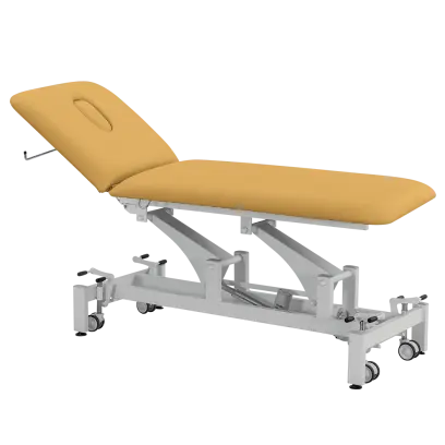2-segmentové jednomotorové lehátko s elektrickým nastavením výšky stolu, hlavová část s otvorem pro obličej s krycí zátkou, komfortní matrace o výšce 70 mm, čalouněna vysoce kvalitní silikonovou kůží MEDI SK