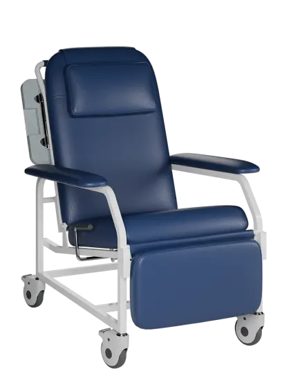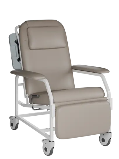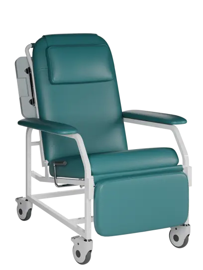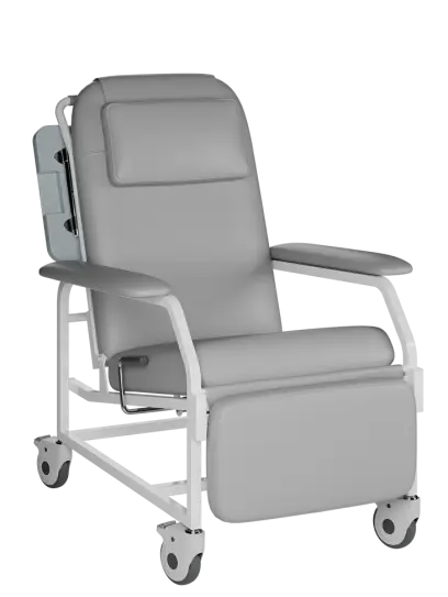mobilní polohovací křeslo, které splňuje vysoké nároky na komfort, hygienu a funkčnost ve zdravotnických a sociálních zařízeních, dlouhé čalouněné područky zvyšují komfort podepření rukou při sezení a zároveň usnadňují vstávání a usedání do křesla
