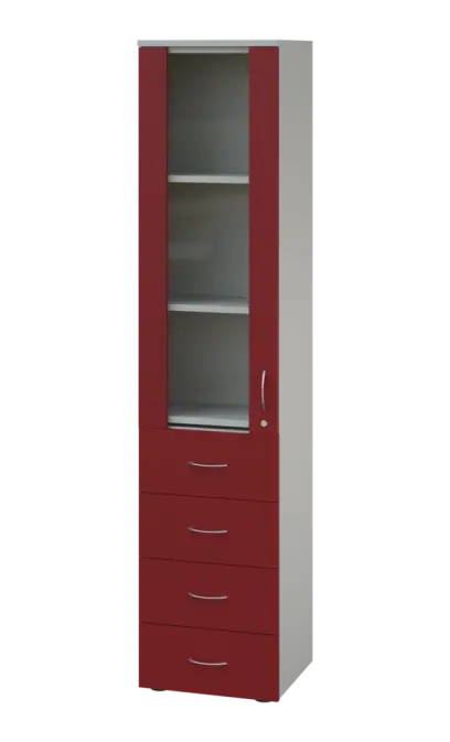 LE - 44 skříň léková prosklená, levá, korpus šedý, dvířka burgundská