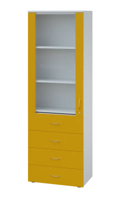 LE - 64 skříň léková prosklená, levá, korpus bílý, dvířka žlutá odio