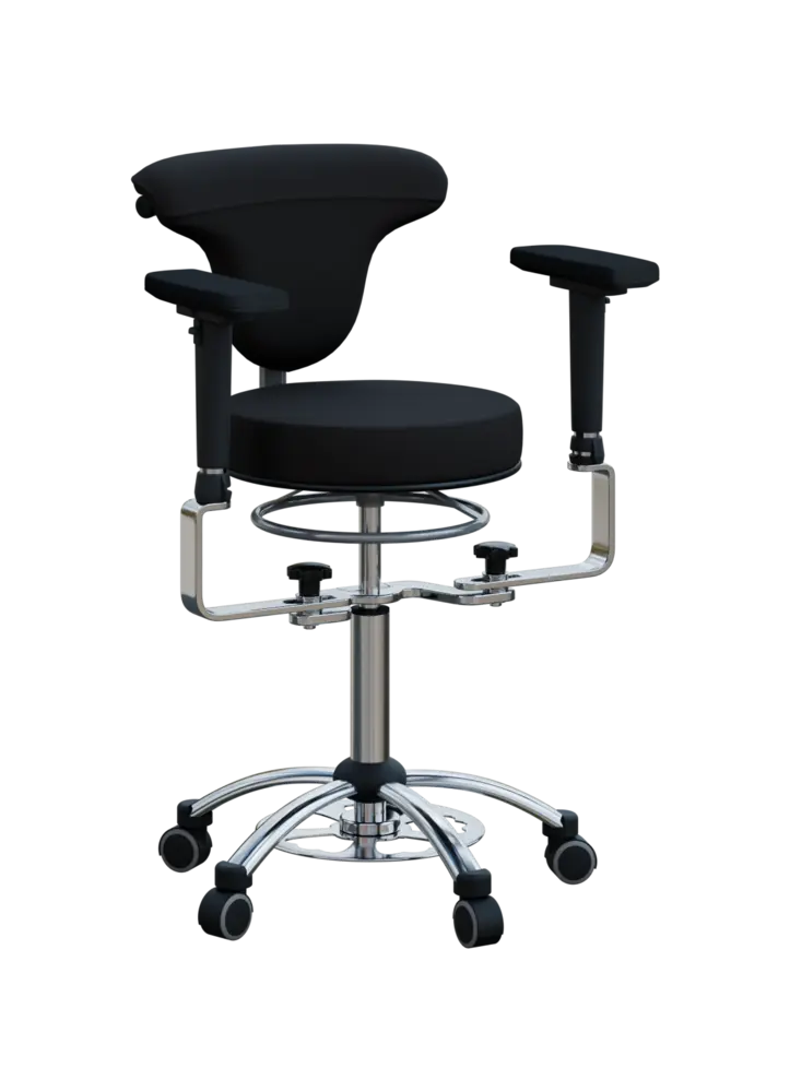 židle s nožním ovládáním, výškové nastavení sedu pomocí nožního ovladače nebo pomocí kruhového ovladače pod celým obvodem sedáku, područky, čalouněno v ekologické kůži
