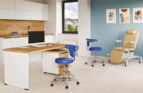 lékařská židle s otočnou zádovou oporou (360°), výškové nastavení sedu, praktická pevná kruhová opěra pro nohy