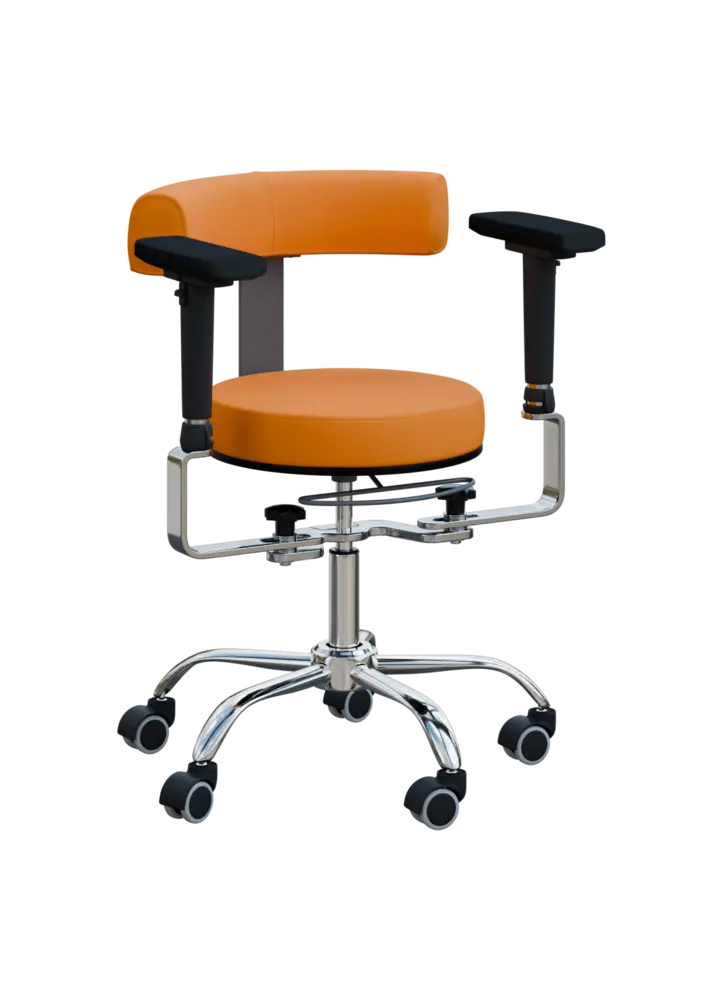 lékařská židle s ergonomicky tvarovanou opěrkou zad, kruhový sedák, područky, čalouněna odolnou ekologickou kůží vhodnou do zdravotnického prostředí