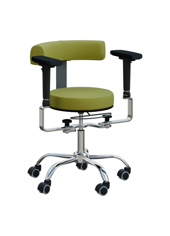 lékařská židle s ergonomicky tvarovanou opěrkou zad, kruhový sedák, područky, čalouněna odolnou ekologickou kůží vhodnou do zdravotnického prostředí