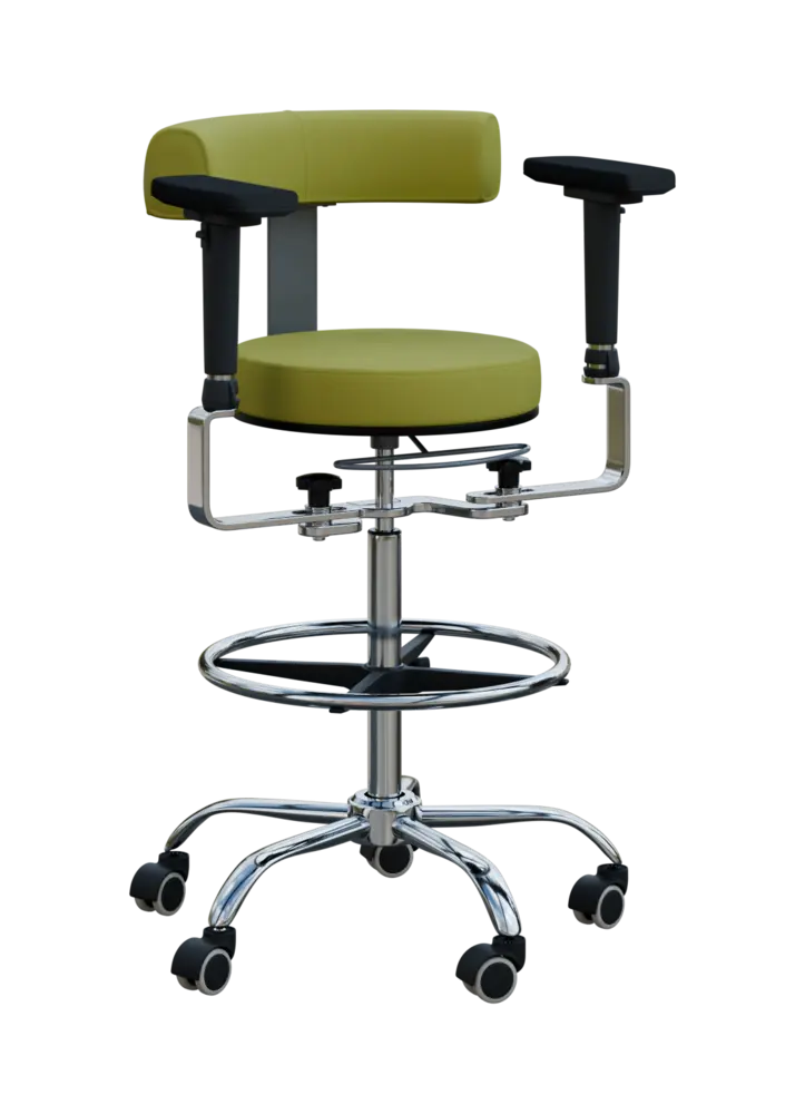 lékařská židle s ergonomicky tvarovanou opěrkou zad, kruhový sedák, područky, čalouněna odolnou ekologickou kůží vhodnou do zdravotnického prostředí