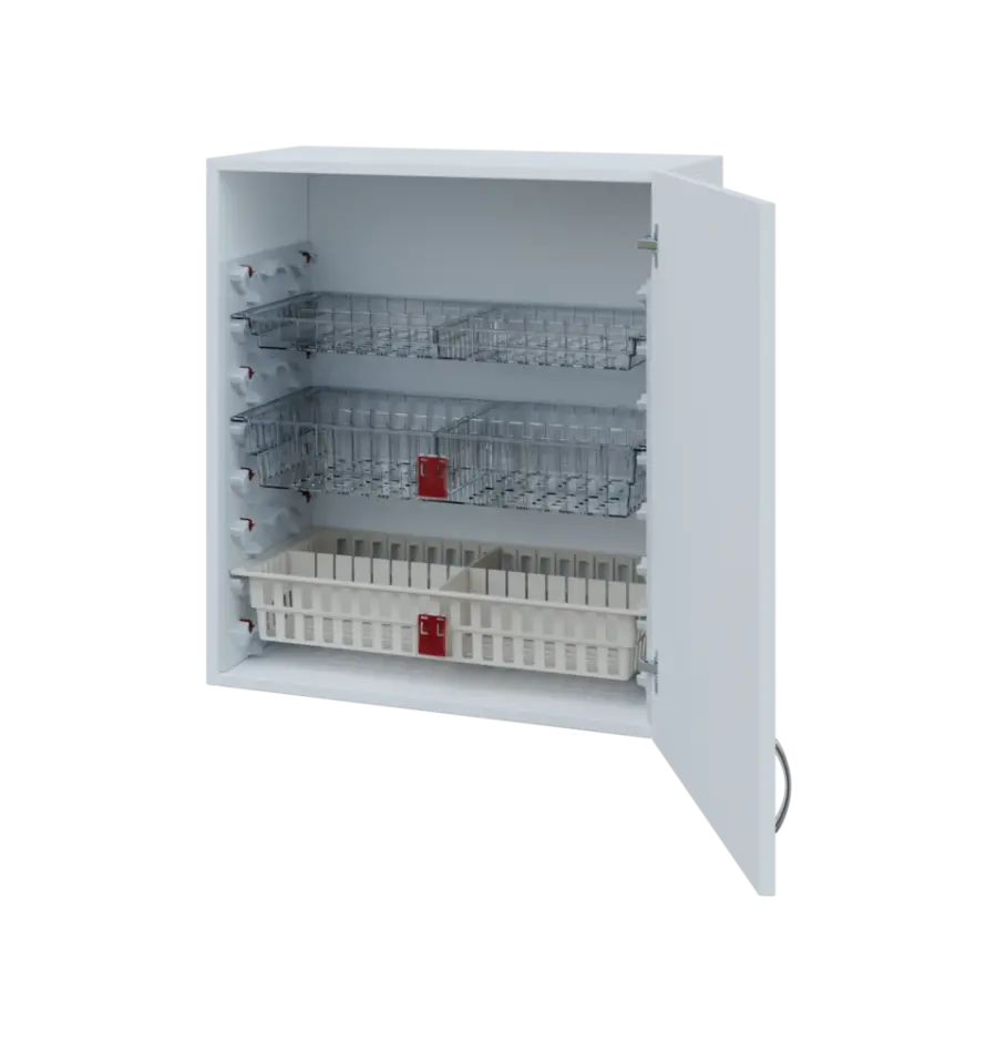 Nábytek EUROMEDICA je přímo dělaný pro koše MEDIBOX. Díky košům MEDIBOX budete mít přehledně uspořádané léky a zdravotnický materiál přesně dle Vašich potřeb. Koše jsou výsuvné, výklopné i vyjímatelné a můžete je libovolně přesouvat ve skříni i mezi skříněmi, regály a vozíky. Vše je přehledné, díky výsuvům výborně přístupné a maximálně využívá prostor. Příprava léků na výdej, jejich předání i převoz je nejjednodušší možný. Prostě box ze skříně dáte do vozíku a obráceně.