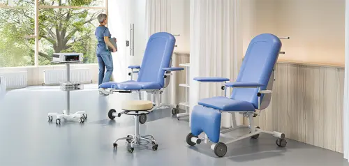 zdravotnická křesla vhodná pro odběry krve, dialýzu, chemoterapii, laryngologii a oftalmologii, čalouněno kvalitní odolnou koženkou, prodloužená nožní část bez válečku na nohy
