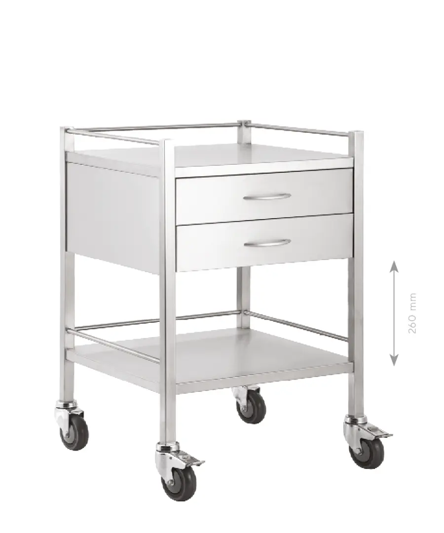 celonerezový 2 - policový vozík s ohrádkou a 2 zásuvkami, ploché police s ohrádkou