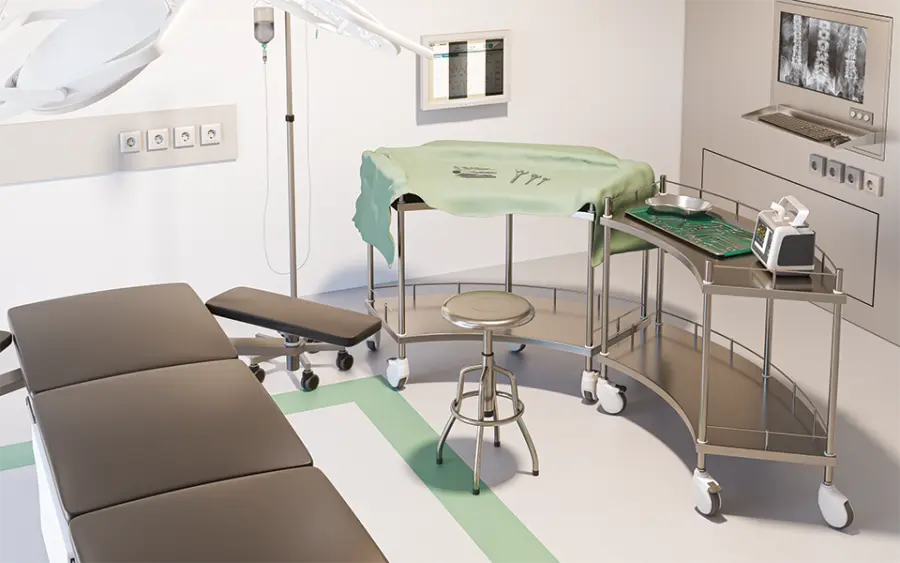 nerezový instrumentační vozík vhodný na operační sál, vhodný na odkládání nástrojů, zaoblený tvar s rádiusem umožňuje umístění stolu co nejblíže k tělu a mít tak vše ihned po ruce