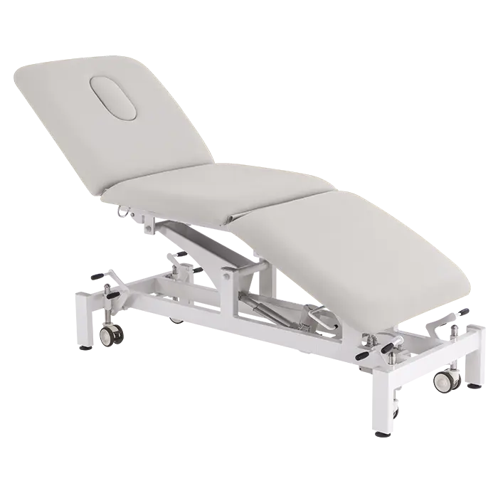 3-segmentové jednomotorové lehátko s elektrickým nastavením výšky stolu, hlavová část s otvorem pro obličej s krycí zátkou, stabilní kovová konstrukce opatřená bílou práškovou barvou