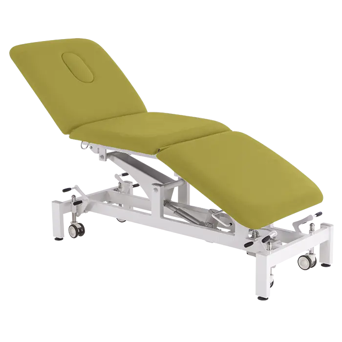 3-segmentové jednomotorové lehátko s elektrickým nastavením výšky stolu, hlavová část s otvorem pro obličej s krycí zátkou, stabilní kovová konstrukce opatřená bílou práškovou barvou
