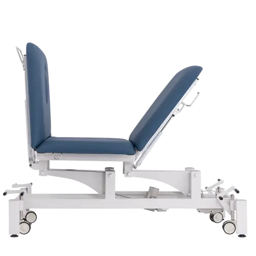 3-segmentové jednomotorové lehátko s elektrickým nastavením výšky stolu, hlavová část s otvorem pro obličej s krycí zátkou, stabilní kovová konstrukce opatřená bílou práškovou barvou