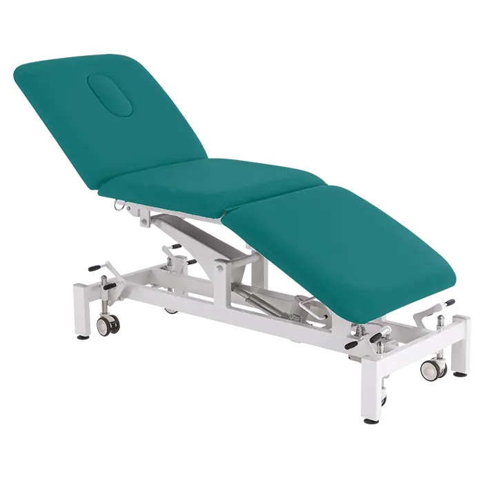 3-segmentové jednomotorové lehátko s elektrickým nastavením výšky stolu, hlavová část s otvorem pro obličej s krycí zátkou, stabilní kovová konstrukce opatřená bílou práškovou barvou
