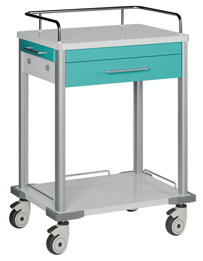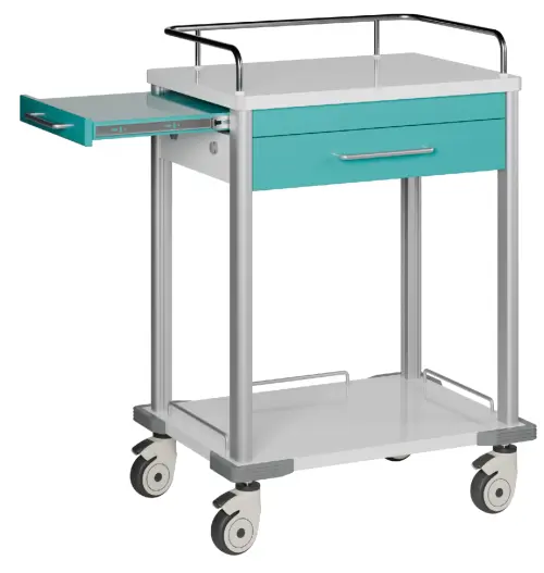 zásuvkový vozík vyroben z kvalitního ocelového plechu se sloupky z hliníkové slitiny, zásuvky vybaveny dělícími příčkami, nerezové ohrádky zabraňuje pádu předmětu