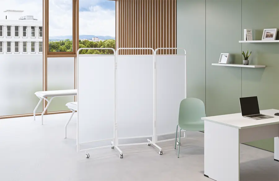 stabilní mobilní zástěna 2 dílná, stabilní pevná nerezová konstrukce s odolnou plastovou výplní o tl. 5 mm v bílém provedení