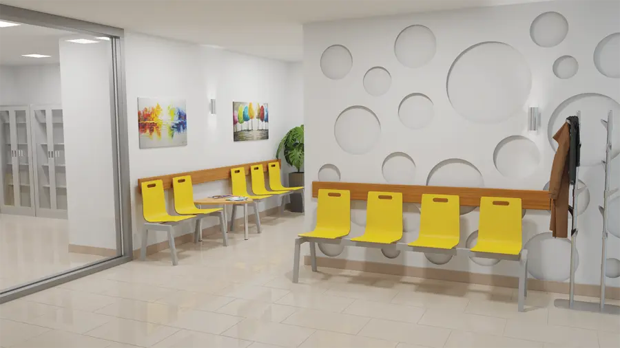 čekárenská lavice s překližkovými sedáky a svařovanou robustní ocelovou kostrou v černém laku