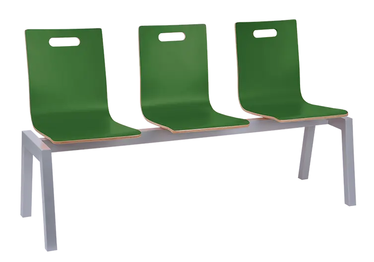 čekárenská lavice s překližkovými sedáky a svařovanou robustní ocelovou kostrou ve stříbrném laku