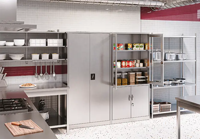 kovová svařovaná skříň s dvouplášťovou konstrukcí pro bezpečné skladování hořlavých látek a chemikálií, skříň má v bocích větrací otvory s tavnými pojistkami