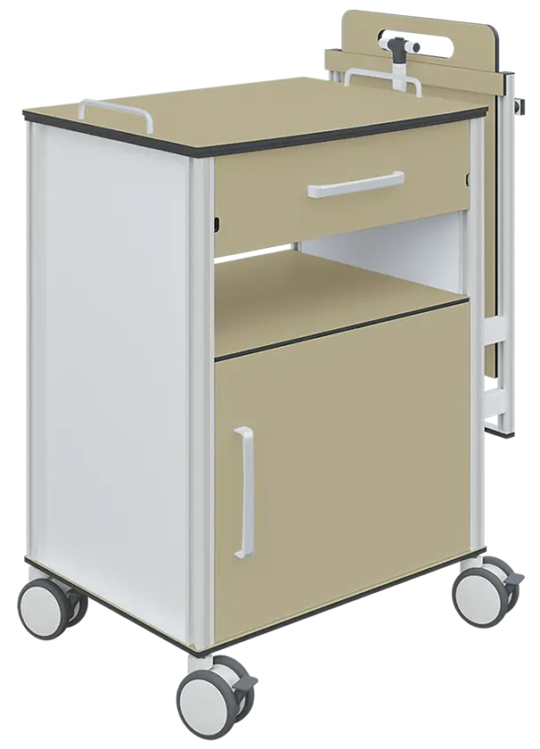 oboustranné noční stolky, zásuvka i skříňka jsou přístupné z přední i zadní strany, což umožňuje univerzální použití jak na levé, tak i pravé straně lůžka, vyrobeny z HPL, která vyniká vysokou odolností proti mechanickému poškození a snadnou údržbou