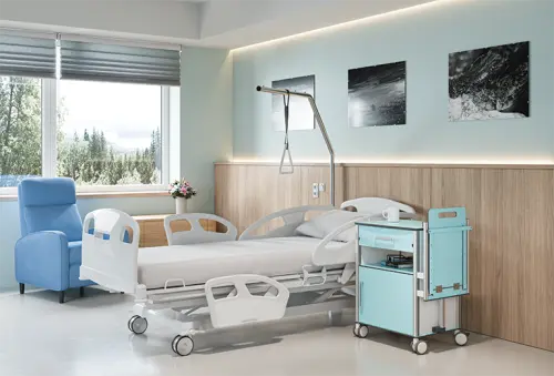 oboustranné noční stolky, zásuvka i skříňka jsou přístupné z přední i zadní strany, což umožňuje univerzální použití jak na levé, tak i pravé straně lůžka, vyrobeny z HPL, která vyniká vysokou odolností proti mechanickému poškození a snadnou údržbou