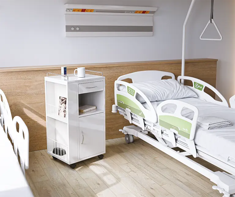 celokovový jednostranný noční stolek v bílém laku, horní deska z bílého lamina s kovovými hrazdami zabraňující pádům předmětů