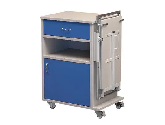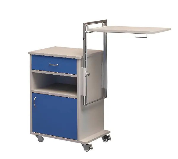 noční stolek s výsuvnou deskou, 2 dvířka (z přední i zadní strany), 4 kolečka z toho 2 s brzdou