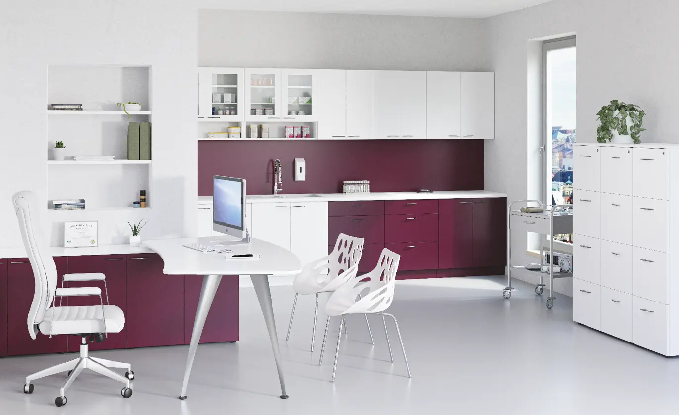 Kuchyňka reprezentuje firmu u zaměstnanců i návštěv. NEXT je základní a všestranná nábytková řada, která lze nakombinovat do jakéhokoliv prostoru. Asymetrické chromové úchytky hodící se k podnožím nábytkové řady NEXT.