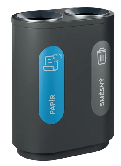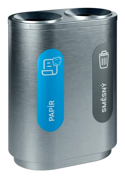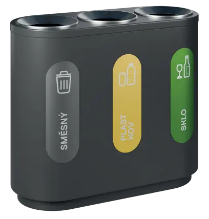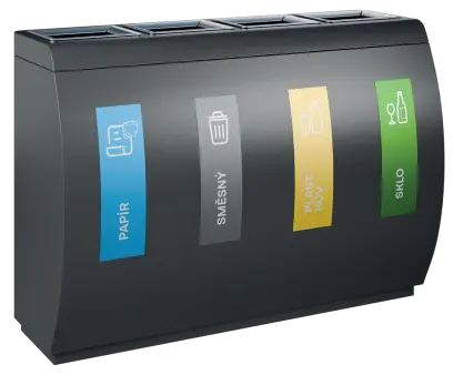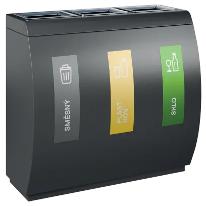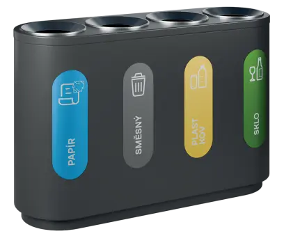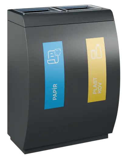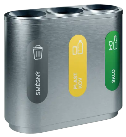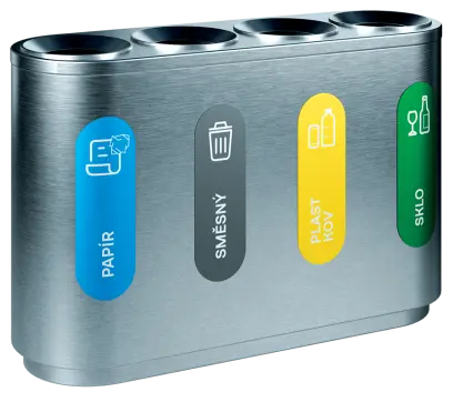 segmentové třídící koše kombinují funkčnost, estetický vzhled a odolné materiálové provedení, vnitřní nádoba z pozinkovaného plechu, třídící koše jsou dodávány spolu se sadou samolepek pro praktické označení dle požadovaného třídění