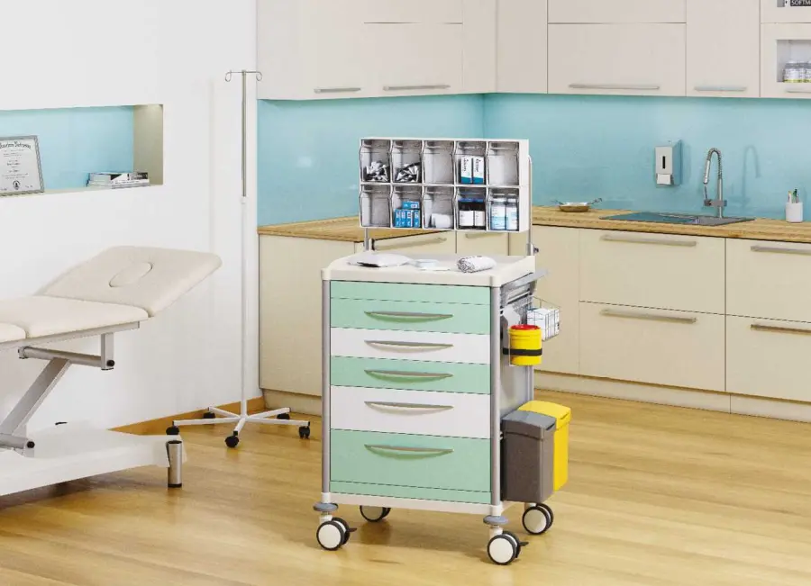 zdravotnický 5-zásuvkový vozík ze svařovaného hliníku, zásuvky opatřeny protiskluzovou podložkou