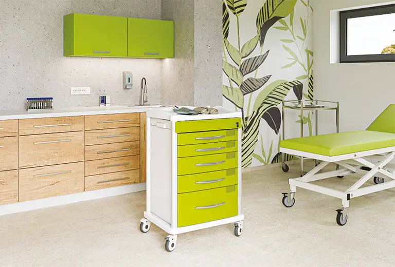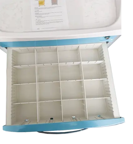 vozík je navržen s důrazem na lehkost, odolnost a praktičnost, zásuvky jsou vybaveny plastovými příčkami pro praktické členění a maximální využití zásuvky, zámek pro centrální zamykání