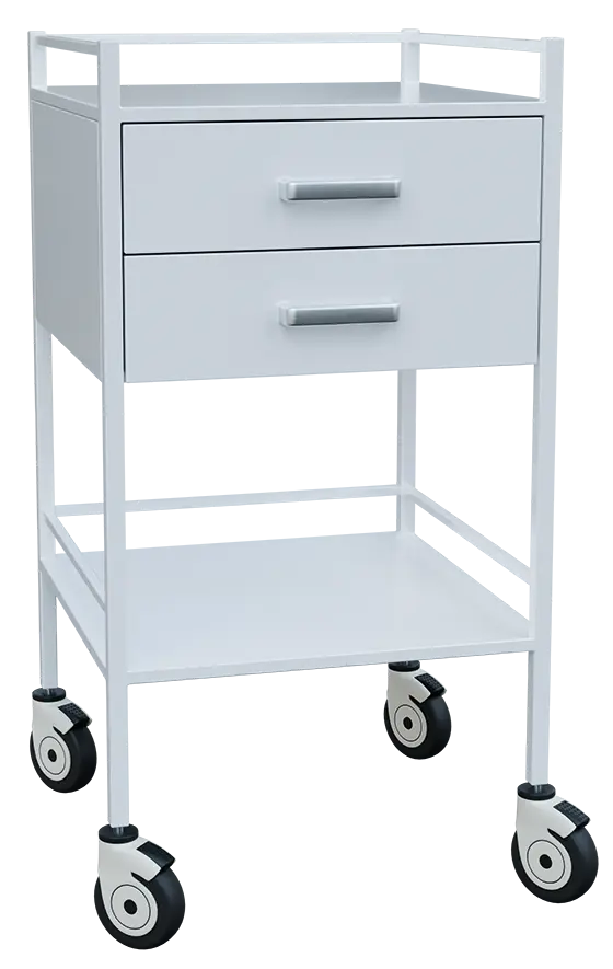 celokovový vozík opatřený bílou práškovou barvou, odkládací plochy opatřeny lakovanou ohrádkou