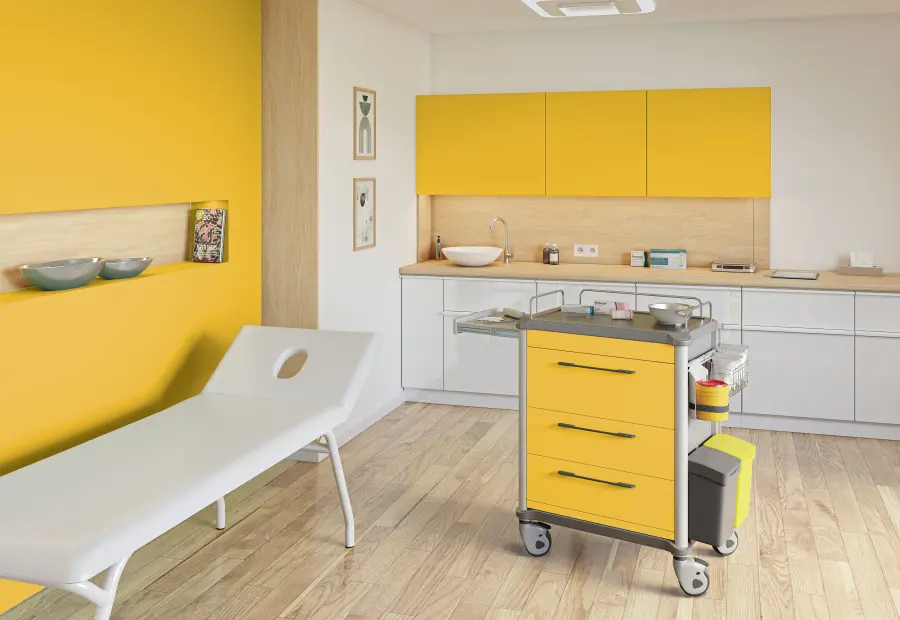 zdravotnický vozík ze svařovaného hliníkového rámu s antivibračními vlastnostmi, zásuvky obsahuji variabilní dělící příčky a protiskluzovou podložku, výsuvná pracovní deska