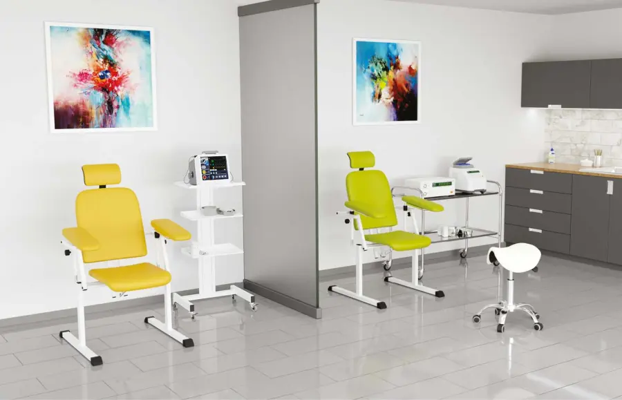 koženkou čalouněné odběrové křeslo s dvěmi výškově a úhlově polohovatelnými a odnímatelnými područkami