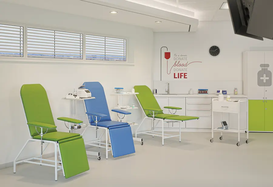 pohodlné křeslo pro odběr krve či dialýzy, stabilní kovové nohy opatřené bílou práškovou barvou, čalouněno koženkou
