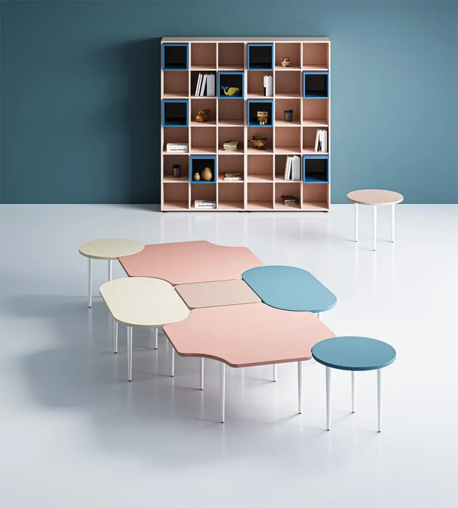 hravé/variabilní/modulární stoly, velké množství kombinací tvarů a barev kreativně rozehrají Váš prostor, kovové nohy, bílý lak