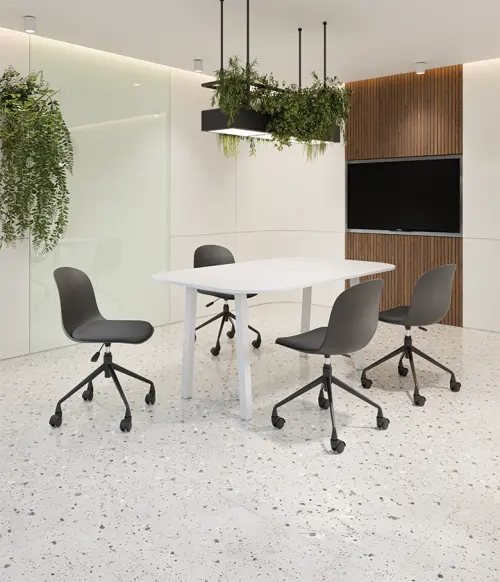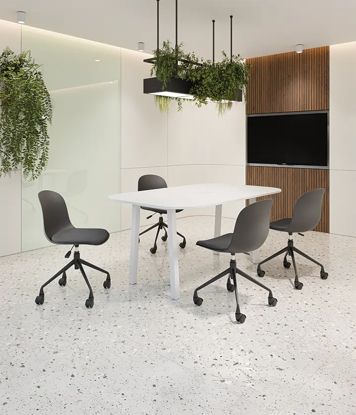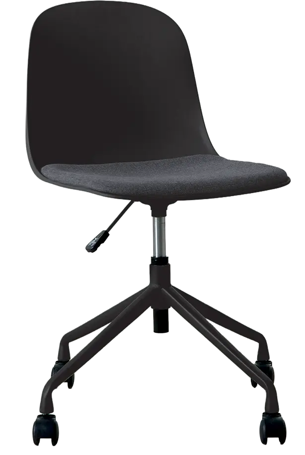 židle na kolečkách minimalistického vzhledu a čistých linií, která se hodí jak k pracovním stolům, tak stolům jednacím nebo do učeben a školících místností, jedinečnost tvoří barevné sladění plastové skořepiny, kovových nohou a čalounění sedáku