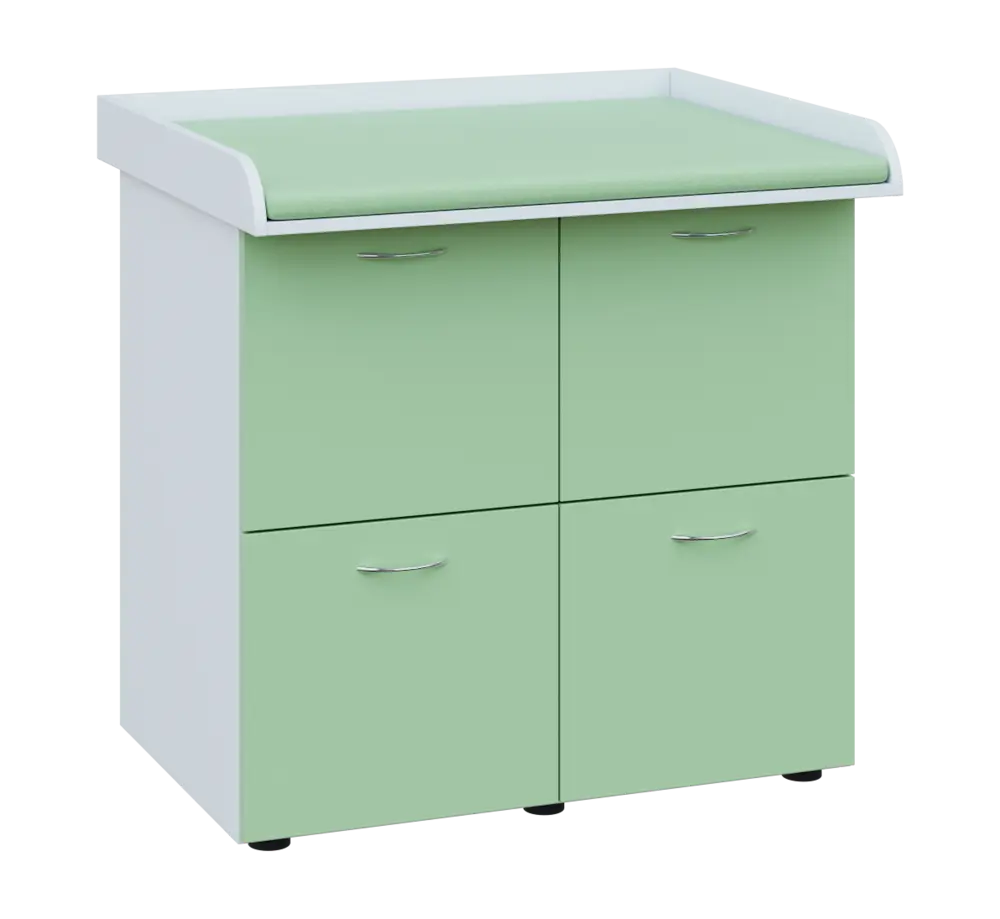 PP - 406 pult přebalovací s matrací, 4x kartotéka, 1000x840x800, korpus bílý, kartotéky šedo-zelinkavá, koženka zelinkavá Z 2