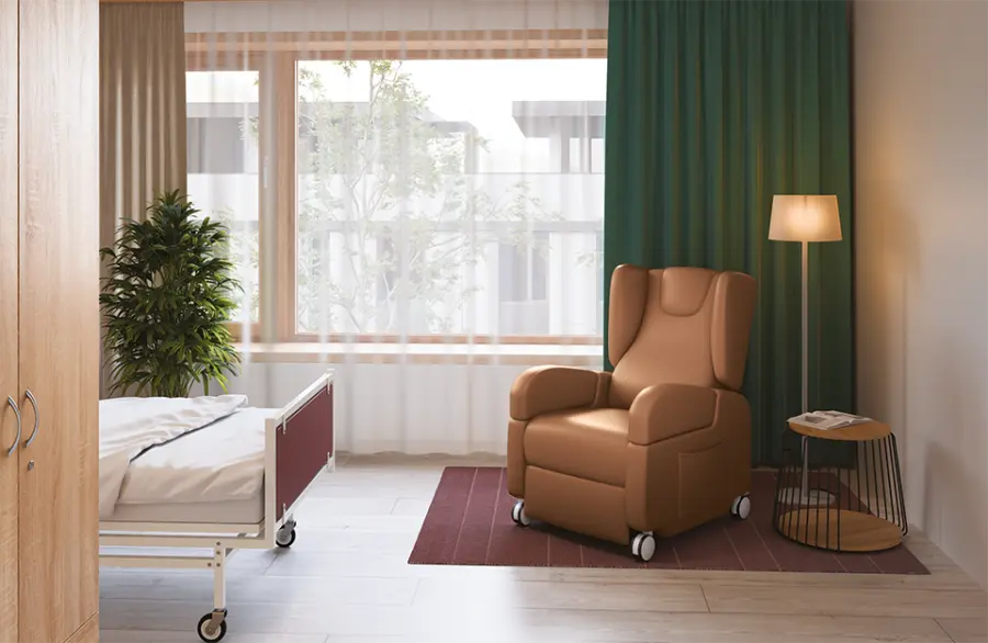 polohovatelné elektricky stavitelné křeslo, výhodou tohoto křesla jsou čtyři velká kolečka pro snadný přesun, pomocí elektrického ovladače lze polohovat opěrák a podnožku na nohy