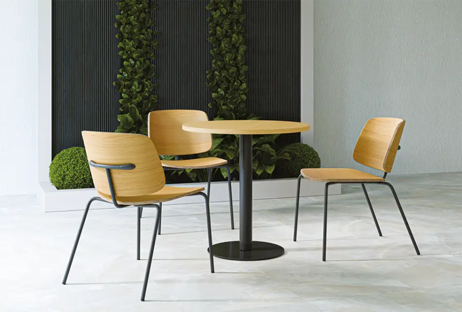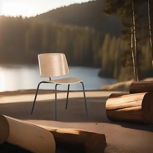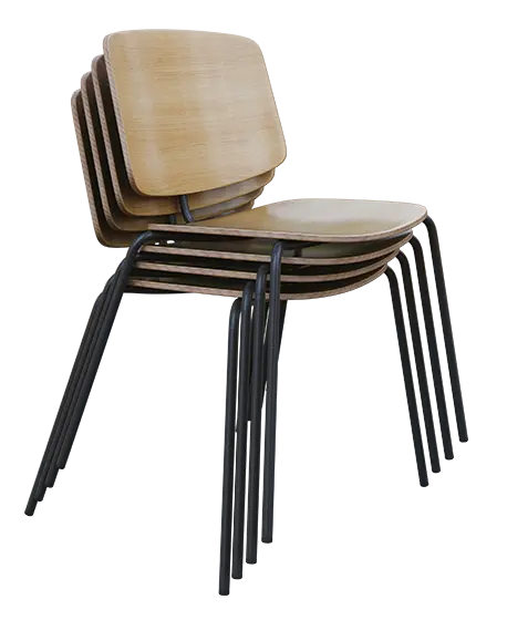 stohovatelná židle na svařované kovové kostře v černém nástřiku, sedák a opěrák z dubové překližky s povrchovou úpravou transparentního laku, plastové kluzáky na ochranu podlahových krytin