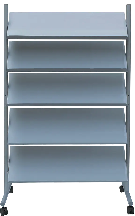 kovový stojan opatřen stříbrnou práškovou barvou, police naklopené pod 45° - přední 40 mm hrana, 4 otočná kolečka vybavená brzdou